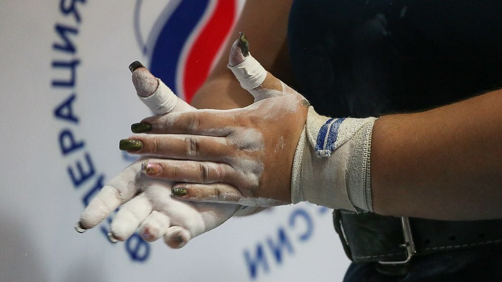 Turaeva on lihaksikas, kalju ja tatuoitu voimanostaja.