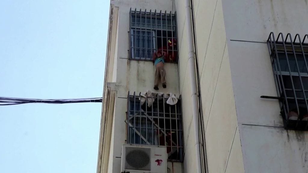Kiinan Shandongin maakunnassa nähtiin lauantaina pelottava tilanne, kun 6-vuotias poika roikkui päänsä varassa metallikehyksestä kerrostalon ikkunassa.