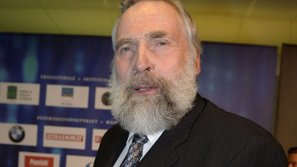 Hiihtäjälegenda ja entinen kansanedustaja Juha Mieto poseerasi hyväntuulisena kameroille kainalosauvoistaan huolimatta.