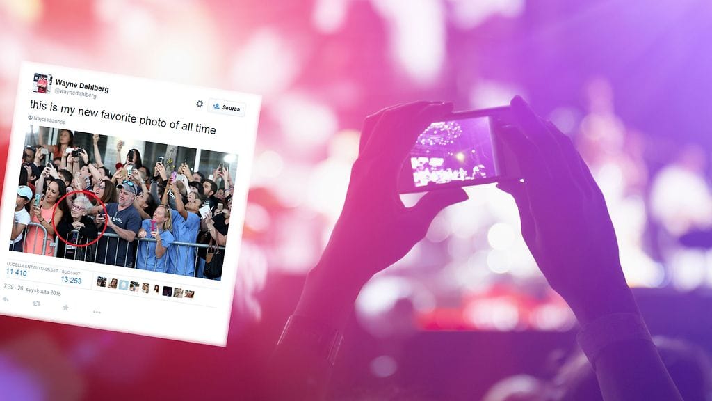 Wayne Dahlberg jakoi kuvan Twitterissä, jossa se on kerännyt jo yli 11 000 uudelleentwiittausta. Ihmiset ylistivät vanhaa rouvaa tilanteesta nauttimisesta, kun muut yleisössä tuijottavat vain älypuhelimiensa ruutuja. Kuva muistuttaa hetkessä elämisen tärkeydestä.