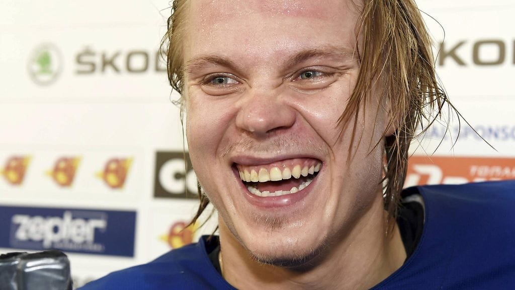 Joukkuekaveri Leo Komarov ikuisti kuvan, jossa Granlund pääsee leikkaamaan juhlakakkua leveä hymy suupielillään.