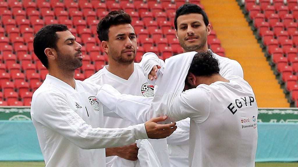 Salah tarvitsi kolmen joukkuekaverinsa apua harjoituspaidan vetämiseen pään yli.