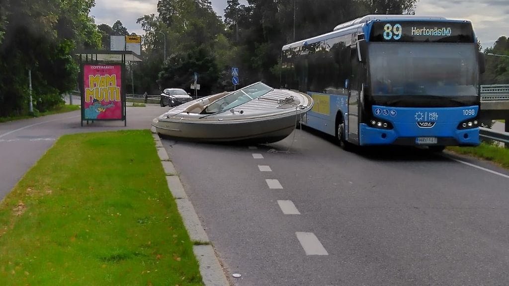 Työpaikalle pyöräillyt helsinkiläinen Wille Kuosmanen kohtasi tiistaina aamulla noin kymmenen aikaa erikoisen ilmestyksen: Itäniitynpolun bussipysäkille oli ilmestynyt suurikokoinen moottorivene.