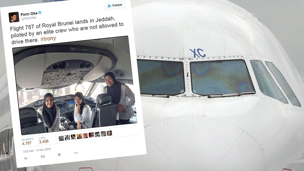 "Royal Brunein lento 787 laskeutui Jeddaan. Konetta ohjasi eliittimiehistö, joilla ei ole lupaa ajaa autoa siellä. #ironia"