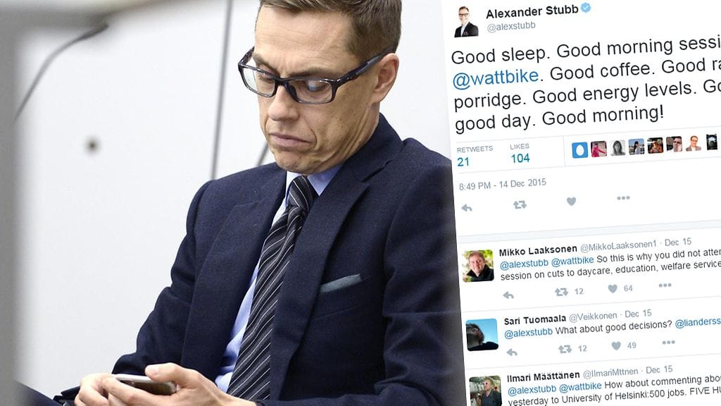 Stubbin twiitti aiheutti useissa kiukkua, sillä samana päivänä eduskunta oli päättämässä mittavista leikkauksista. Lue lisää täältä.