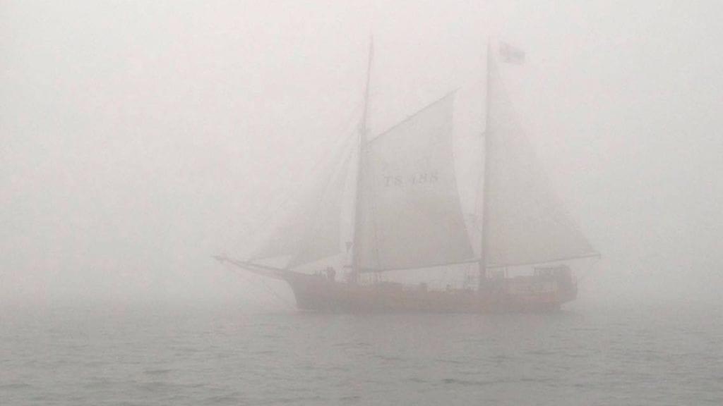Laura Vähätupa kertoo olleensa liikkeellä moottoriveneellä, kun yhtäkkiä sumun seasta erottui purjeveneen ääriviivat.