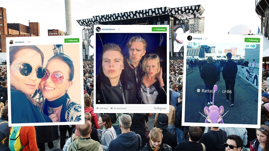 Suosikkijuontaja Jaajo Linnonmaa kertoo Instagramissa saavuttaneensa pohjan. Hän pelaa Pokémon Go -peliä festivaalialueella.