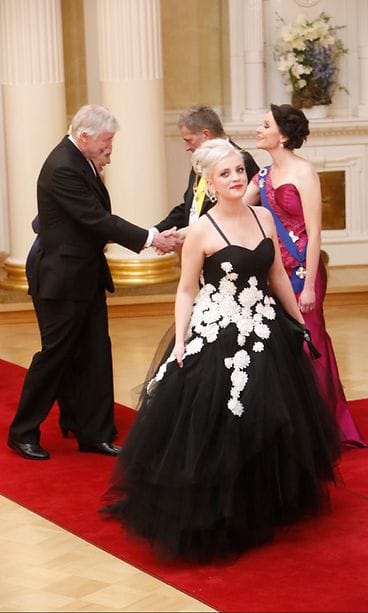 Kansa on puhunut! Rouva Jenni Haukio valloitti sydämet fuksian punaisessa iltapuvussaan.