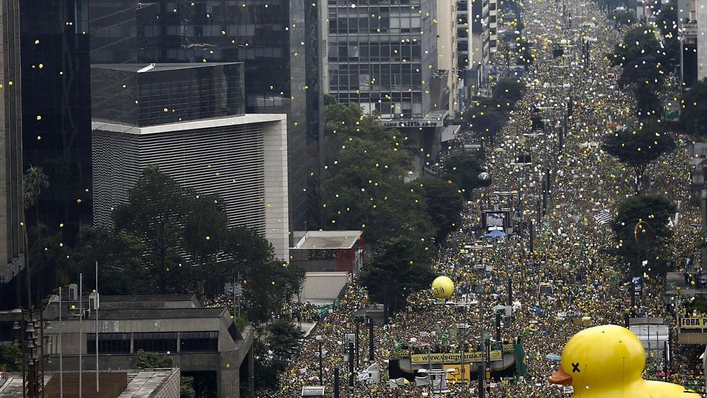 Brasilian talousongelmiin ja hallinnon korruptioon kyllästyneet mielenosoittajat vaativat presidentti Dilma Rousseffia virkarikossyytteeseen. Hänen epäillään vääristelleen budjettia peitelläkseen Brasilian julkisen talouden ongelmia.