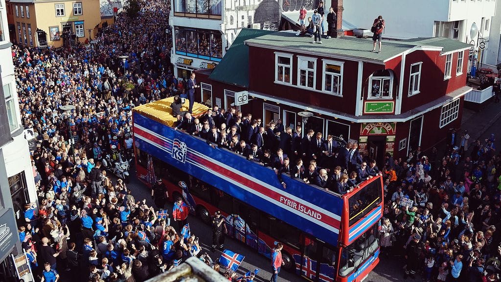 Tämän jälkeen joukkue siirtyi kaksikerroksisella bussilla keskustaan ja Arnarhollin puistoon, jossa järjestettiin juhlatilaisuus. Pelaajat juhlivat kymmenien tuhansien paikalle saapuneiden fanien kanssa, ja jälleen kerran nähtiin EM-kisoista tuttu taputuksista ja hu-huudoista koostuva viikinkien sotaveisu.