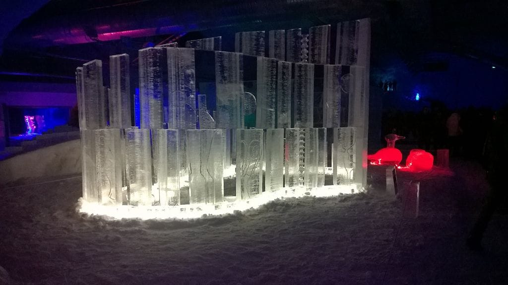 Jääluolaan rahdattiin yhteensä 1000 jääpalaa kooltaan 1 x 0,5 x 0,5 m eli 250.000 kg sekä 400 neliötä lunta. Niistä rakentuivat muurit ja monet rakennelmat MM-kisan taustoiksi.