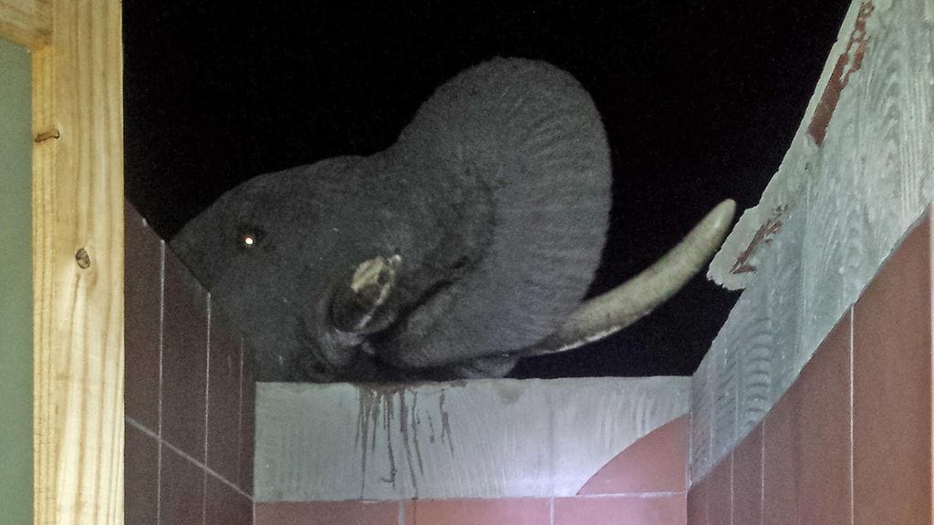 Leirintäalueella tarjotaan eläimille juomavettä, mutta se voi olla suolaista, joten osa eläimistä nauttii mieluummin kurkunkostukkeensa suoraan vessanpöntöstä. Elefantit eivät säikähdä edes peseytyviä ihmisiä, vaan pitkä kärsä saattaa ilmestyä seinän takaa jonkun ollessa suihkussa.