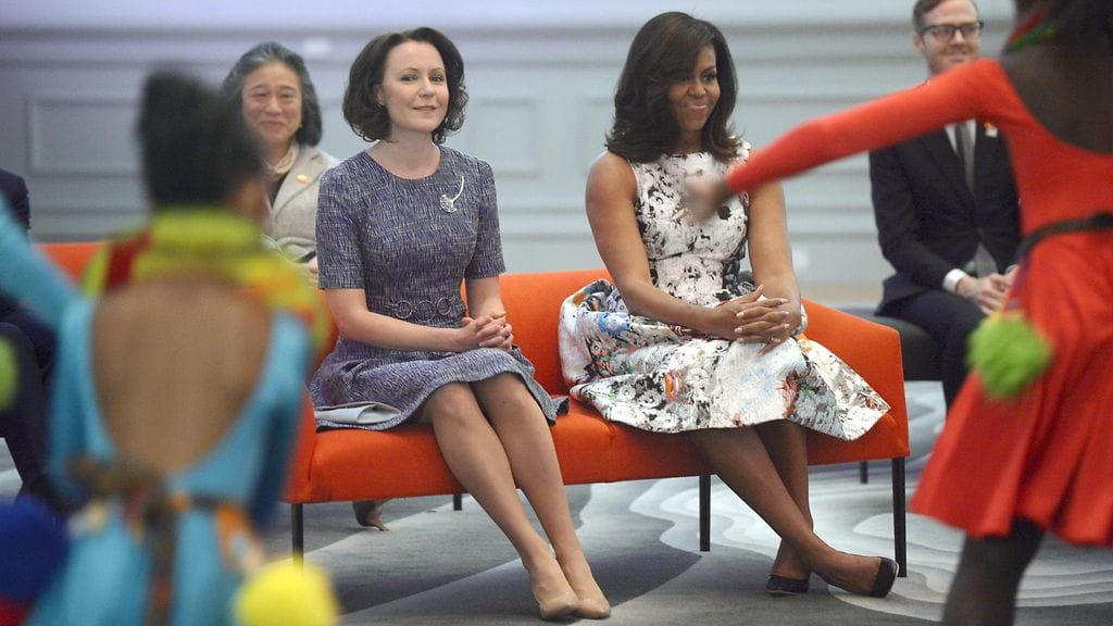 Rouva Jenni Haukio viihtyi galleriassa yhdessä Michelle Obaman kanssa.