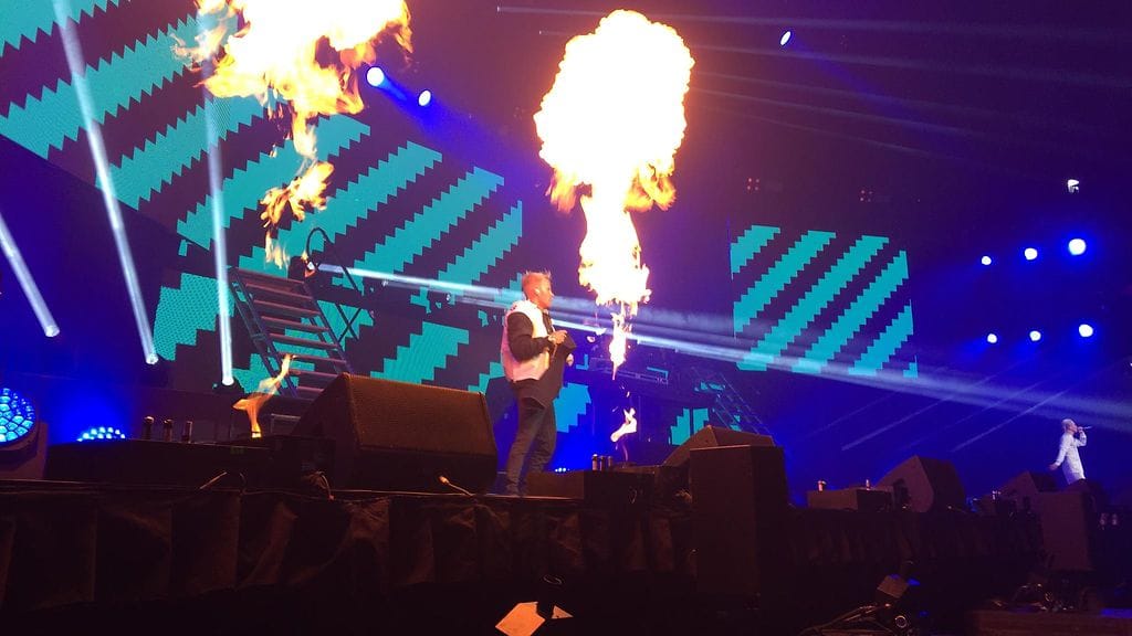 Kaksikko aloitti keikan Älä jätä roikkuu -hittibiisillään pyrotekniikan valaistessa koko keikkapaikan.