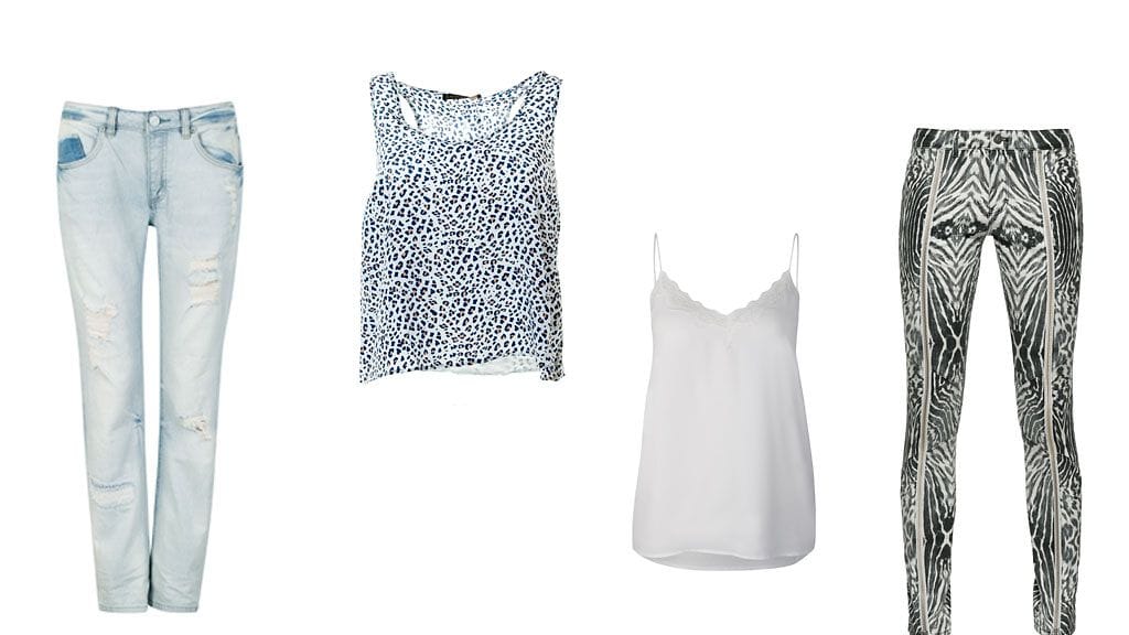 Housuissa on printtejä ja farkuista nähdään paljon erilaisia variaatioita, jopa rikottuja farkkuja.
