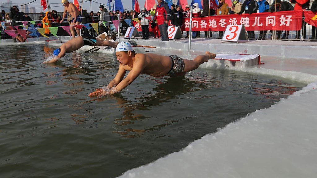 Koilis-Kiinassa sijaitsevassa festivaalissa lämpötila oli rapea 14 pakkasastetta tiistaina, kun uimarit hyppäsivät avajaisissa avantouimakilpailuun.