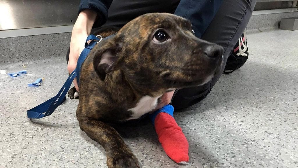 Kuusi kuukautta vanha staffordshirenbullterrieri Lexi selvisi kuin ihmeen kaupalla hengissä, vaikka oli nielaissut lihaveitsen.