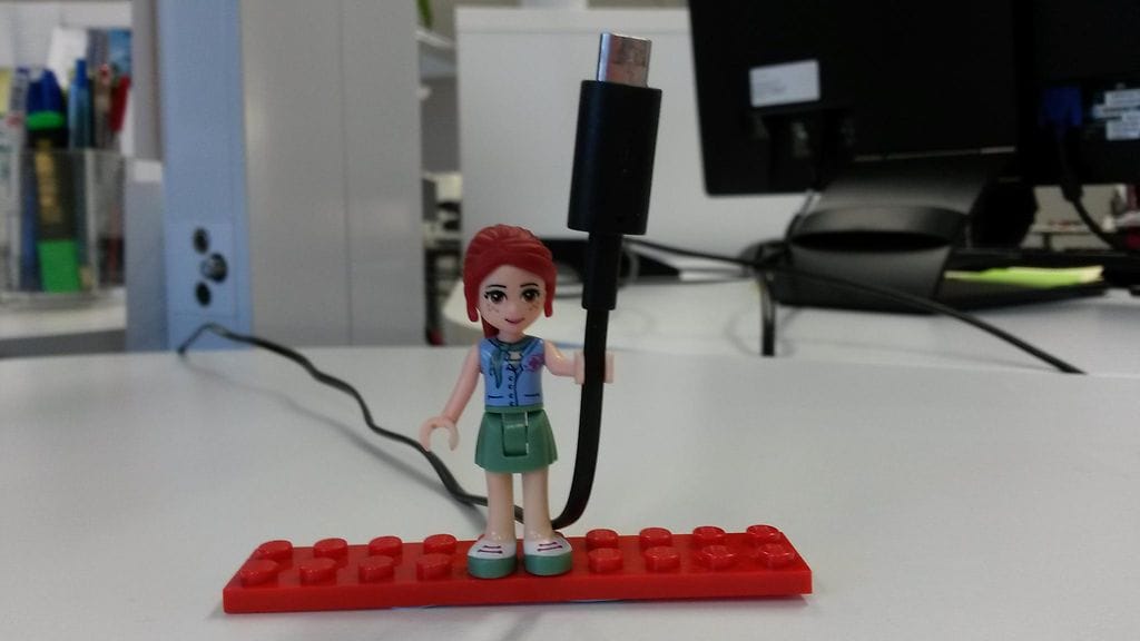 Kaiva esiin lego-ukot! Niiden pieneen käteen sujahtaa helposti kännykän laturin johto. Tarvitset lego-ukkelin tai -tyttelin sekä ohuen legolevyn.