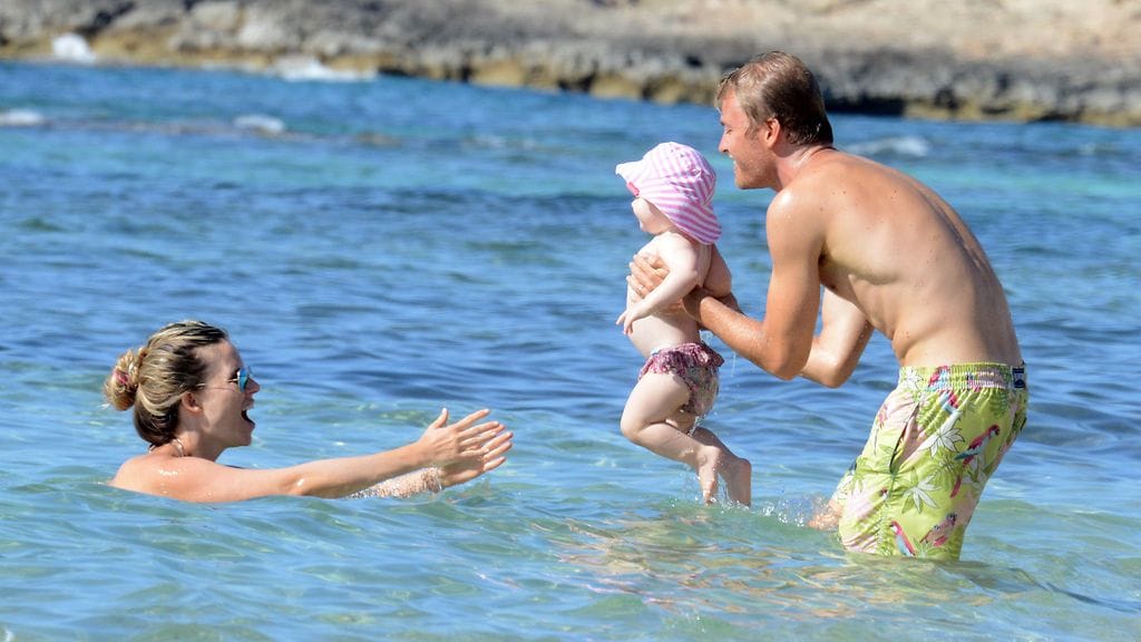 Nico Rosberg, Vivian-vaimo ja parin vuoden ikäinen Alaïa-tytär nauttivat kesäpäivästä Espanjan Formenterassa.