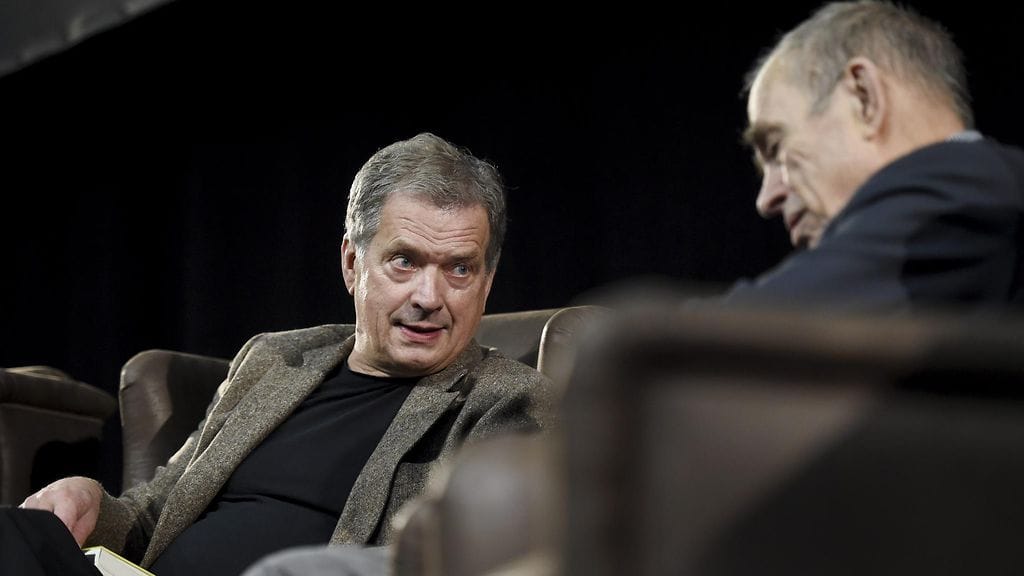 Tasavallan presidentti Sauli Niinistö ja kirjailija, entinen kansanedustaja Jörn Donner keskustelivat lauantaina kirjallisuudesta ja kirjoittamisesta Helsingin Kirjamessuilla.