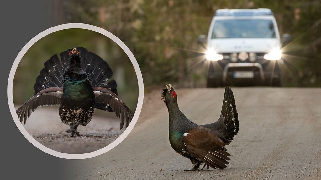 Luontovalokuvaaja Kimmo Kuisma oli kuvaamassa kodiksi tienvarteen asettunutta urosmetsoa, joka on vahtinut reviiriään soidinmenojen aikaan. Sattumalta myös vapunviettoa vahtinut poliisipartio saapui ihastelemaan metsoa.