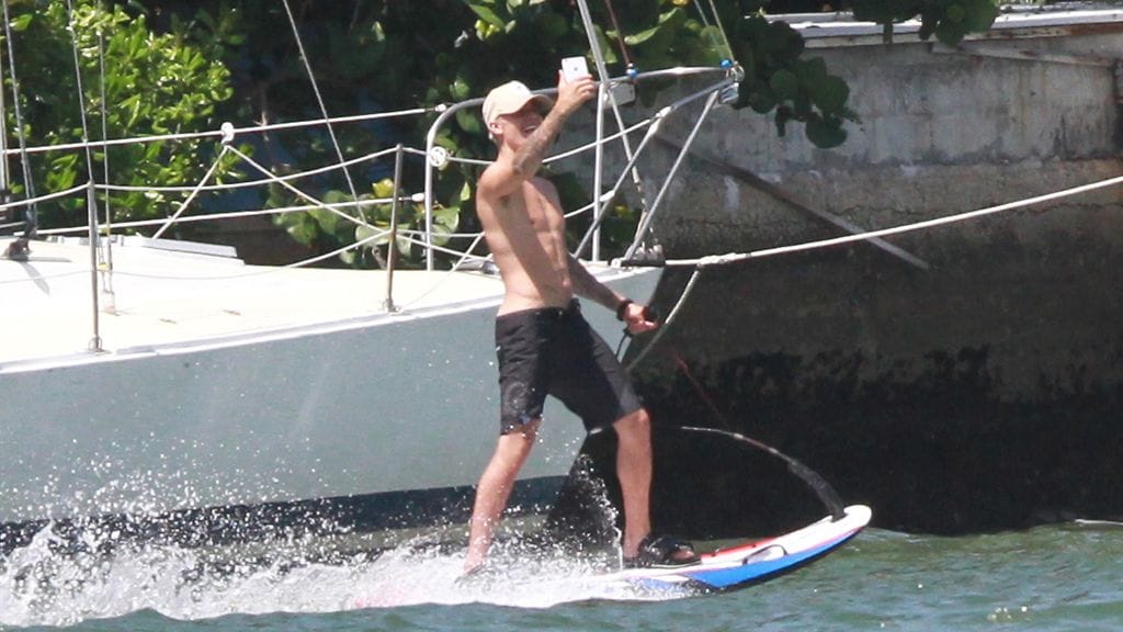 Paidatta vesileikeissä ilakoiva poppari ei paljon välitä tipahtaako kännykkä mereen. Justin Bieber nappailee selfieitä iPhonellaan vesilaudan päällä tasapainotellen.