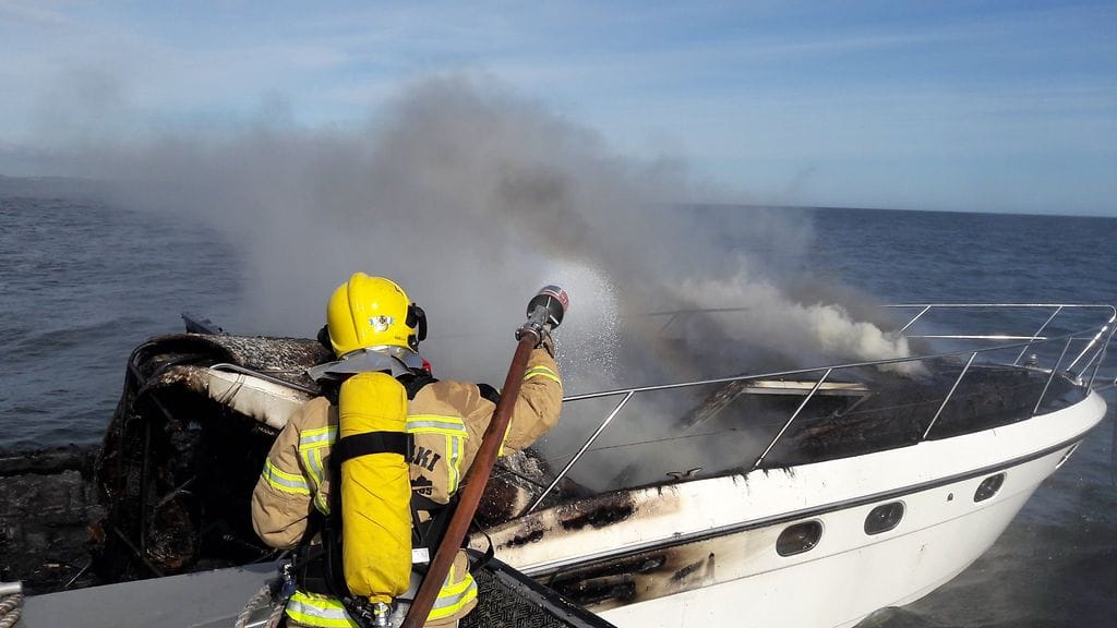 Helsingin pelastuslaitos julkaisi kuvan Twitterissä, jossa näkyy, kuinka pahasti vene paloi onnettomuudessa.