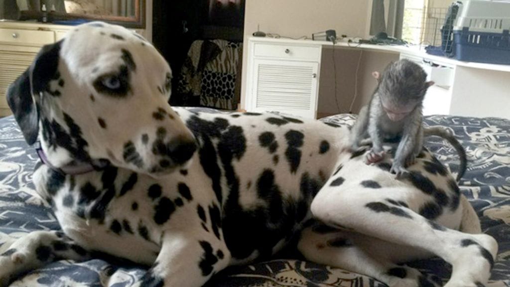 Pepe La Pew -niminen apina pelastettiin Zimbabwesta, jonka jälkeen se päätyi asumaan perheeseen, jossa oli jo ennestään dalmatiankoira Indigo. Eläimet ystävystyivät pian.