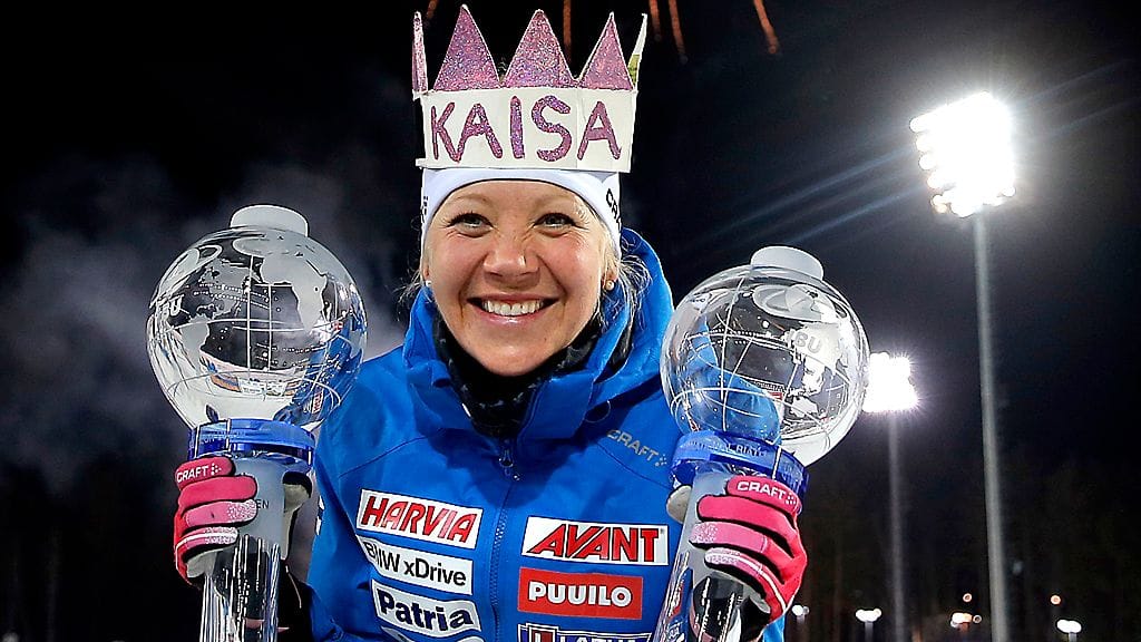 Ampumahiihtäjä Kaisa Mäkäräinen pääsi juhlimaan uransa kolmatta maailmancupin kokonaisvoittoa Venäjän Tjumenissa sunnuntaina.