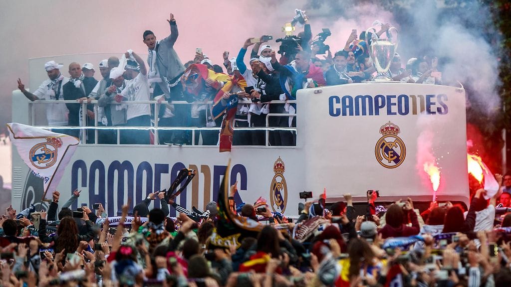 Real-pelaajat laskeutuivat kotikaupunkiin aamukuudelta, suuntasivat Madridin keskustaan välittömästi Mestarit-tekstillä varustetulla avonaisella bussilla ja villitsivät faninsa konfettisateessa.