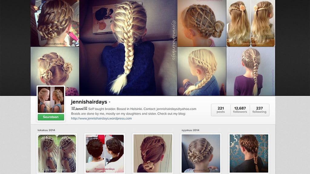 Lettikampaukset ovat olleet pinnalla jo jonkin aikaa, mutta Jenni’s Hairdays blogissa sievät ranskanletit kohoavat uusiin ulottuvuuksiin. Jenni Petänen osaa kietoa hiukset upeille leteille ja kampauksille tai muotoilla niistä vaikkapa hämähäkin tai perhosen. Toinen toistaan taidokkaampia kampauksia katsellessa ei ihmetytä, että tuhannet ihmiset ympäri maailmaa seuraavat Jennin tytärten tukkatyylejä Instagramissa.