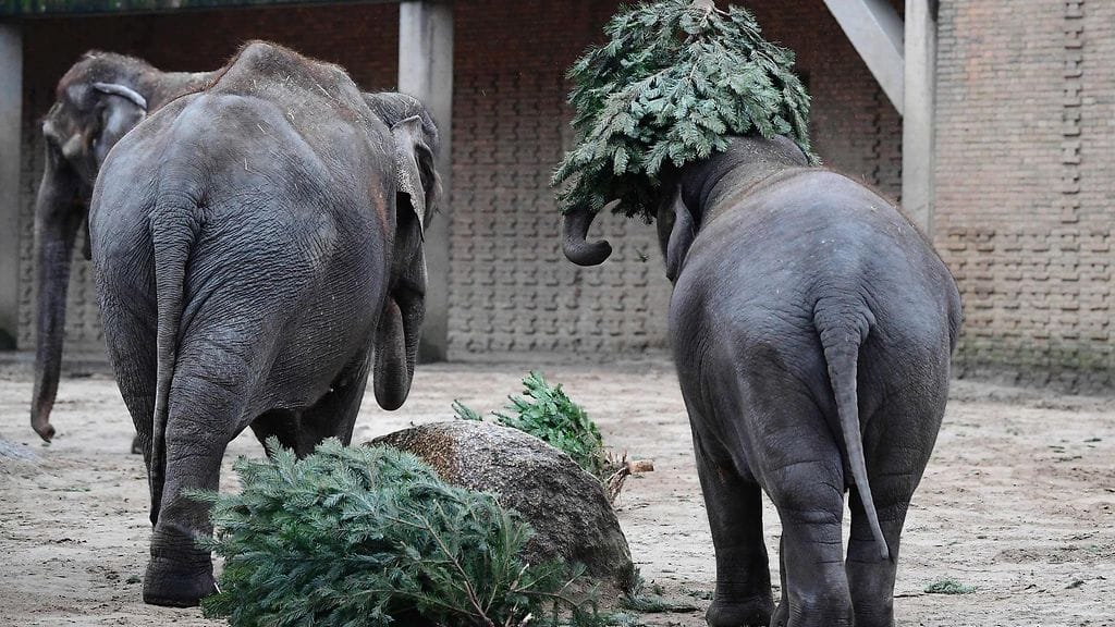 Berliinissä Saksassa paikallisen eläintarhan norsut ovat saanet yllätyksiä pitkin viikkoa, kun myymättä jääneitä joulukuusia on tuotu eläimille pureskeltaviksi ja pöyhittäviksi.