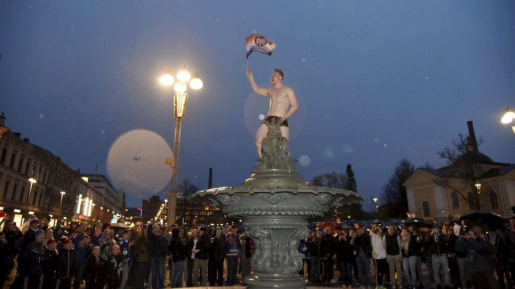 Rohkeimmat Tappara-fanit uskaltautuivat jopa kastautumaan suihkulähteessä Tampereen keskustorilla.