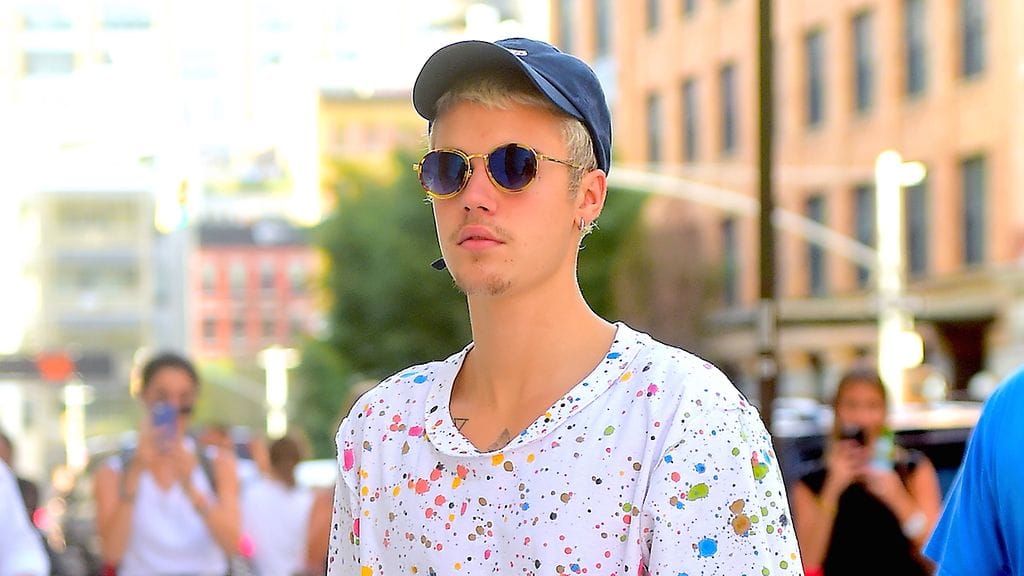 Värikkääseen paitaan ja roikkuviin lappuhaalareihin pukeutunut Bieber väläyttikin keskisormea faneille ja kuvaajille kävellessään ravintolaan sisään.
