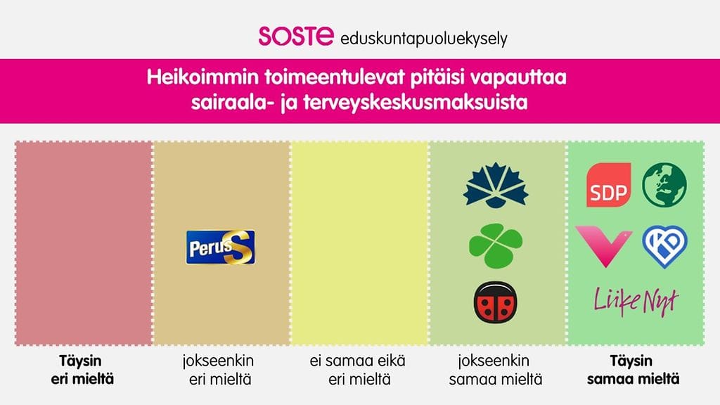 Valtaosa eduskuntapuolueista haluaa vapauttaa pienituloiset sairaala- ja terveyskeskusmaksuista. Vain perussuomalaiset ovat asiasta jokseenkin eri mieltä.