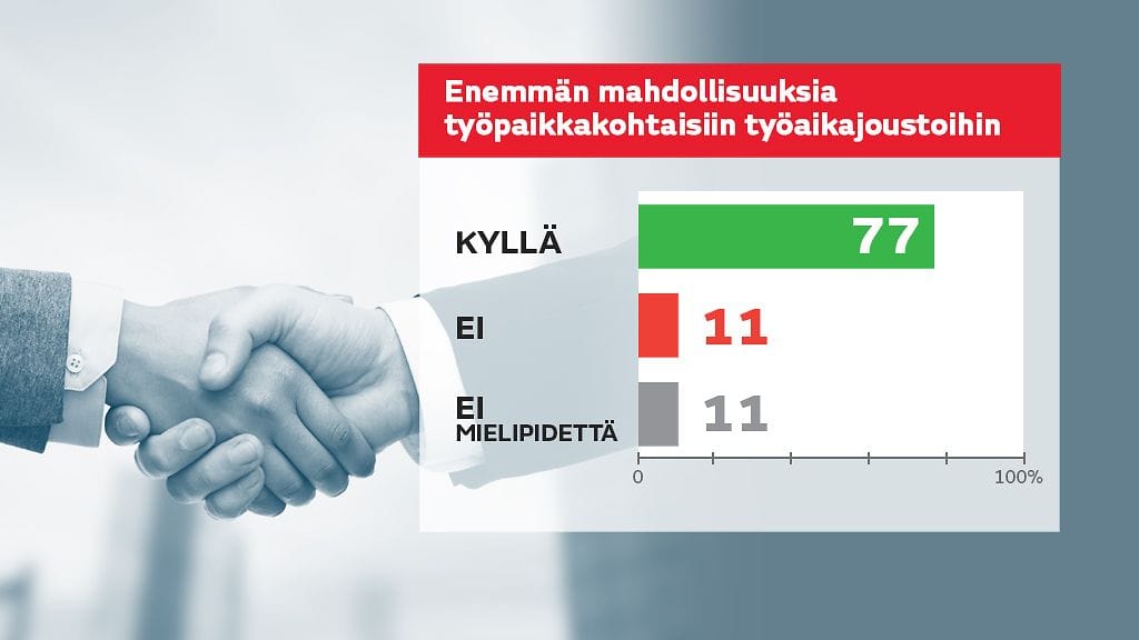 Vain 10 prosenttia kyselyyn vastanneista on sitä mieltä, ettei työpaikkakohtaisia joustoja pitäisi tehdä.