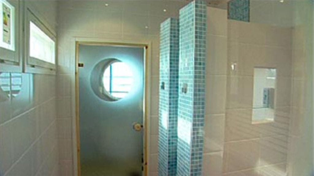 Suihkujen välissä on seinämä, jossa on hauskana yksityiskohtana aukko lasihyllyineen. Seinäkkeen päässä on niin ikään lokerikko, johon voi laittaa kylpyhuoneessa tarvittavia tavaroita.