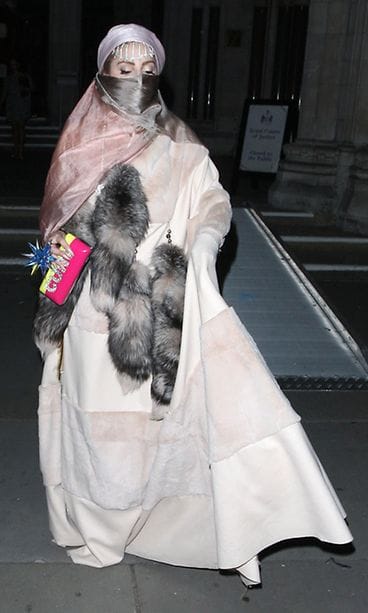Lady Gaga valokuvattiin matkalla kotiin Philip Traceyn kesämalliston näytöksestä ja sai yleisön kulmakarvat taas kohoamaan. Gaga oli pukeutunut asuun, joka muistutti erehdyttävästi burkaa. Laulaja oli peittänyt osan kasvoistaan vaaleanpunaiseen ja valkoiseen asuun kuuluvalla hunnulla. Kokonaisuuteen oman säväyksensä toi kankaasta roikkuva oravanturkki.
