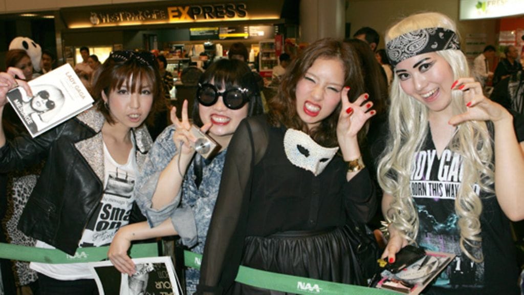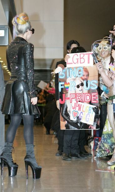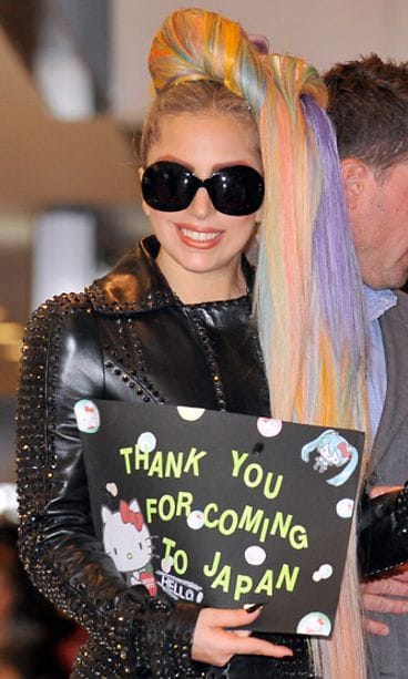 Born this Way Ball -maailmankiertueensa aloittanut Lady Gaga, 26, saapui Tokion lentokentälle mustanpuhuvassa nahka-asussa, , mutta myös varsin värikkäässä hiustyylissä. Hiustenpidennykset napannut tähti oli solminut sateenkaaren väriset hiuksensa poninhännälle. Värit kuvastavat Gagan sanojen mukaan tokiolaisten sielunmaiseman värejä.