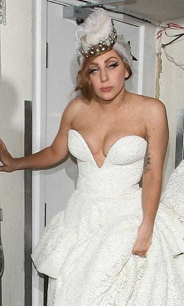 Gaga oli pukeutunut iltaa varten tapansa mukaan erikoiseen asuun. Laulajan yllä oli massiivinen, valkoinen, hääpukua muistuttava iltapuku. Hätkähdyttävintä asussa oli erityisen antava kaula-aukko.