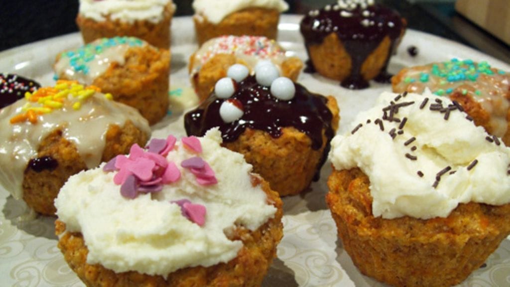 Koristele kuorrutetut muffinit erilaisilla kakkukoristeilla, sokeroiduilla appelsiininkuorilla, pähkinärouheella tai marsipaaniporkkanoilla.
