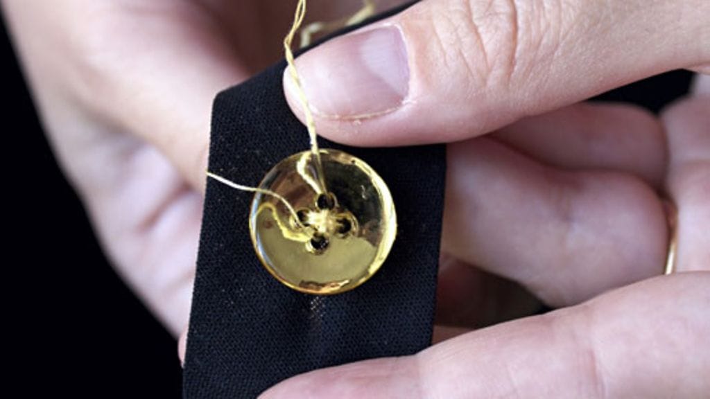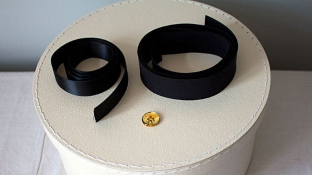 Leikkaa musta nauha sopivan mittaiseksi ja ompele sen keskelle kultainen nappi.