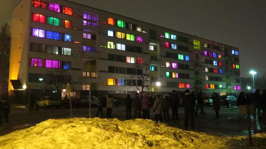 Lahden Liipolassa pimeää ja loskaista kerrostalomaisemaa ilostutti eilen komea valoteos.