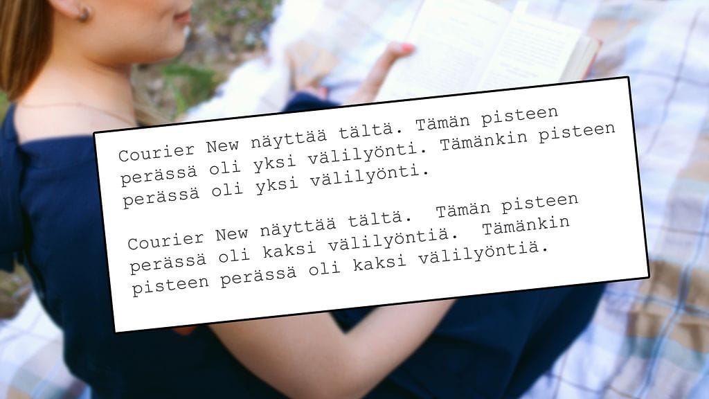 Oikeasti pisteen jälkeen kannattaisi laittaa kaksi välilyöntiä. Demonstroimme tapaa tässä kappaleessa. Se saattaa vaikuttaa suotuisasti lukunopeuteesi!