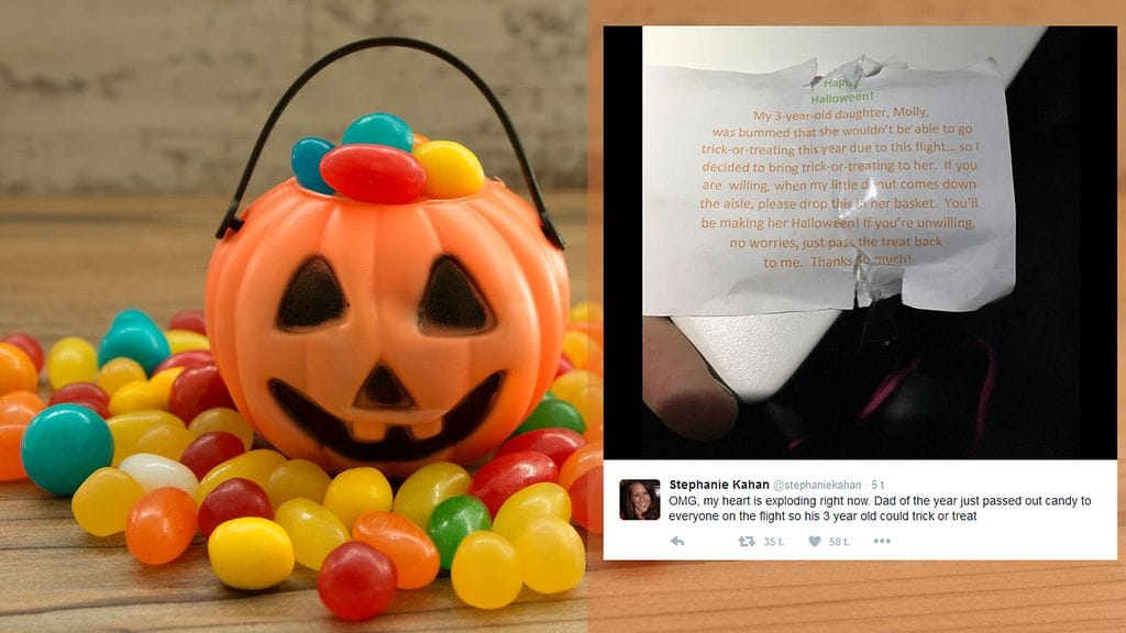 Isä jakoi karkkeja muille lentomatkustajille, ja vei sitten kolmevuotiaan tyttärensä karkki vai kepponen -kierrokselle. Muut matkustajat olivat ihastuneita, ja Stephanie Kahan -niminen nainen jakoi kuvan karkista ja isän jättämästä lapusta Twitterissä.