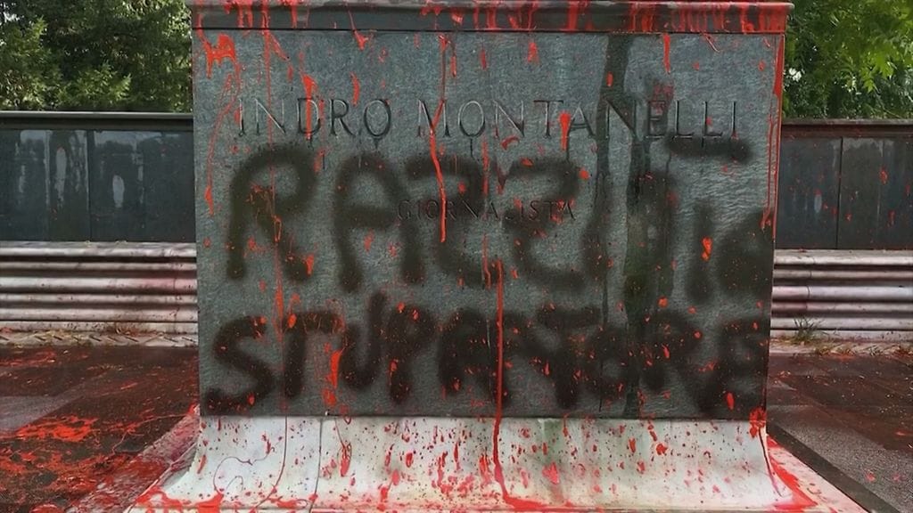 Kuten yllä olevalta videolta näkee, Indro Montanellin patsas töhrittiin kirkkaanpunaisella maalilla. Patsaan jalustaan oli kirjoitettu italiaksi mustalla värillä sanat: rasisti ja raiskaaja.