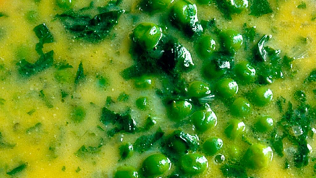 1. Paista sipulia, voita ja currya kattilassa. Lisää liemi, keitä 10 minuuttia ja lisää herneet ja persilja. Ota kattila liedeltä, sekoita mukaan ruohosipuli ja tarjoile.