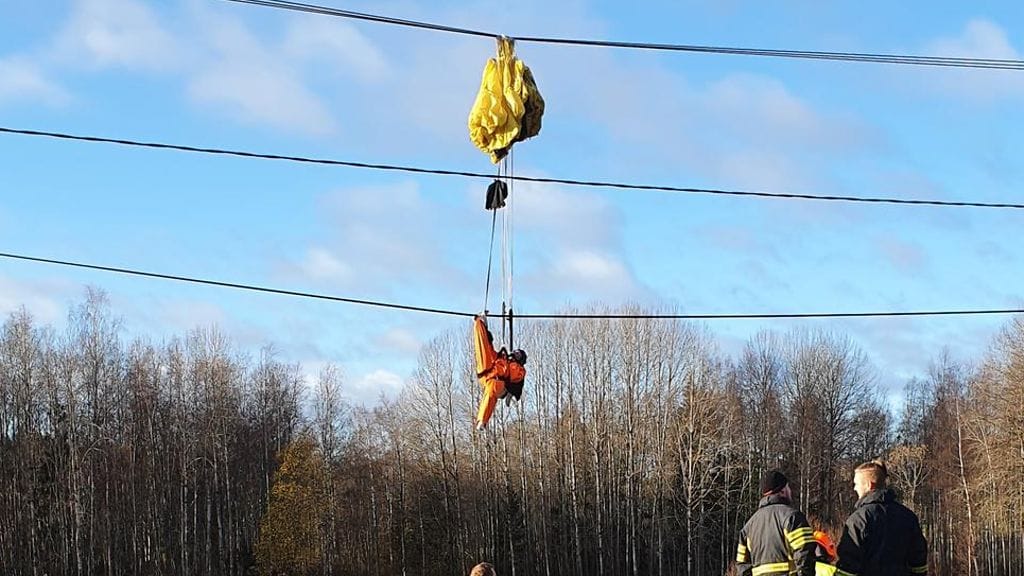 Kun he saapuivat paikalle oli pelastuslaitos jo selvittämässä asiaa. Hyppääjä roikkui langoista pää alaspäin sähköjohdoissa.
