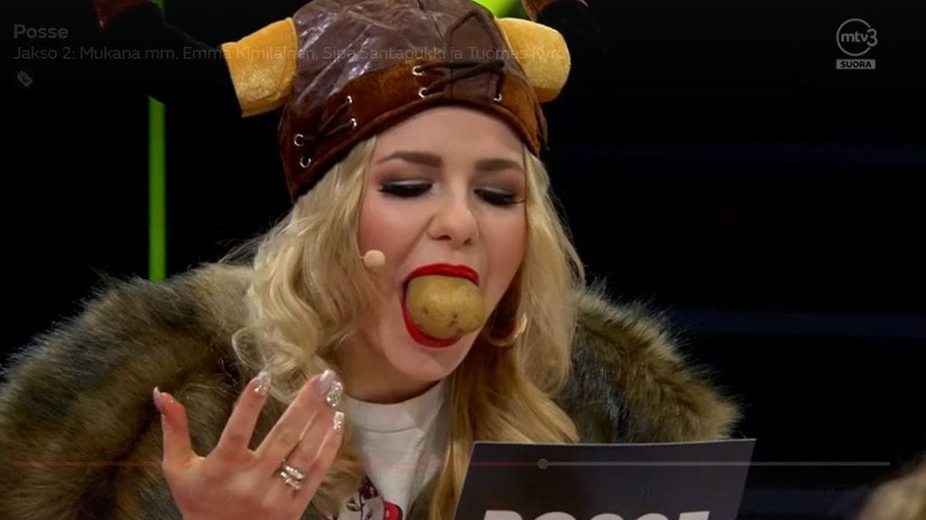 Seuraavaksi on Leppälän vuoro. Hän laittaa perunan suuhunsa ja yrittää sanoa oman lauseensa.