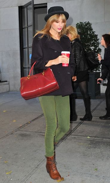Laulaja-näyttelijä Taylor Swift, 23, suuntasi kohti Victoria's Secret -alusvaatemerkin näytöstä New Yorkissa. Swift oli valinnut ylleen pirteän mutta rennon asukokonaisuuden, jossa leikiteltiin vastaväreillä: punaisella ja vihreällä. Jopa Swiftin punainen kahvimuki tuki asun värejä.